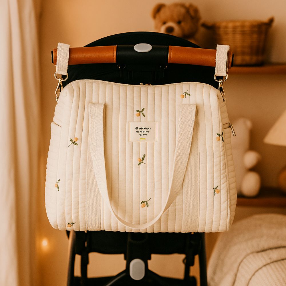 Le Sac à Langer Bandoulière Brodé combine un design matelassé tendance, des rangements fonctionnels et un port confortable en bandoulière pour garder les essentiels de bébé toujours à portée de main, sans compromis sur le style.